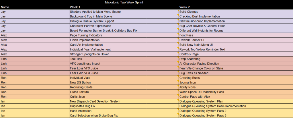 I used excel to break down shorter sprints and communicate individual responsibilities to each member of the team. The color coding was made consistent from sprint to sprint and notes were taken from weekly meeting and attached to the excel sheet in regards to each task.