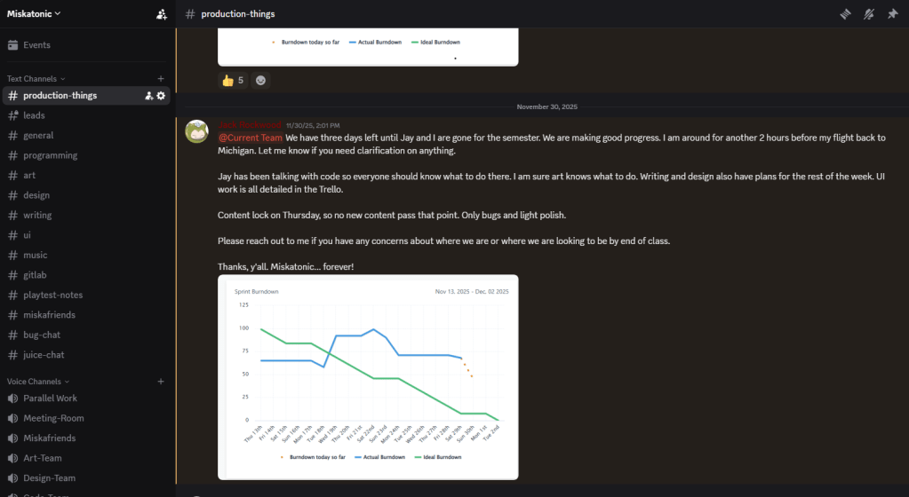 Finally, I used discord for communication among the team members and updating the contributors from week to week. We used discord to track bugs, meet among disciplines, and work remotely synchronously.